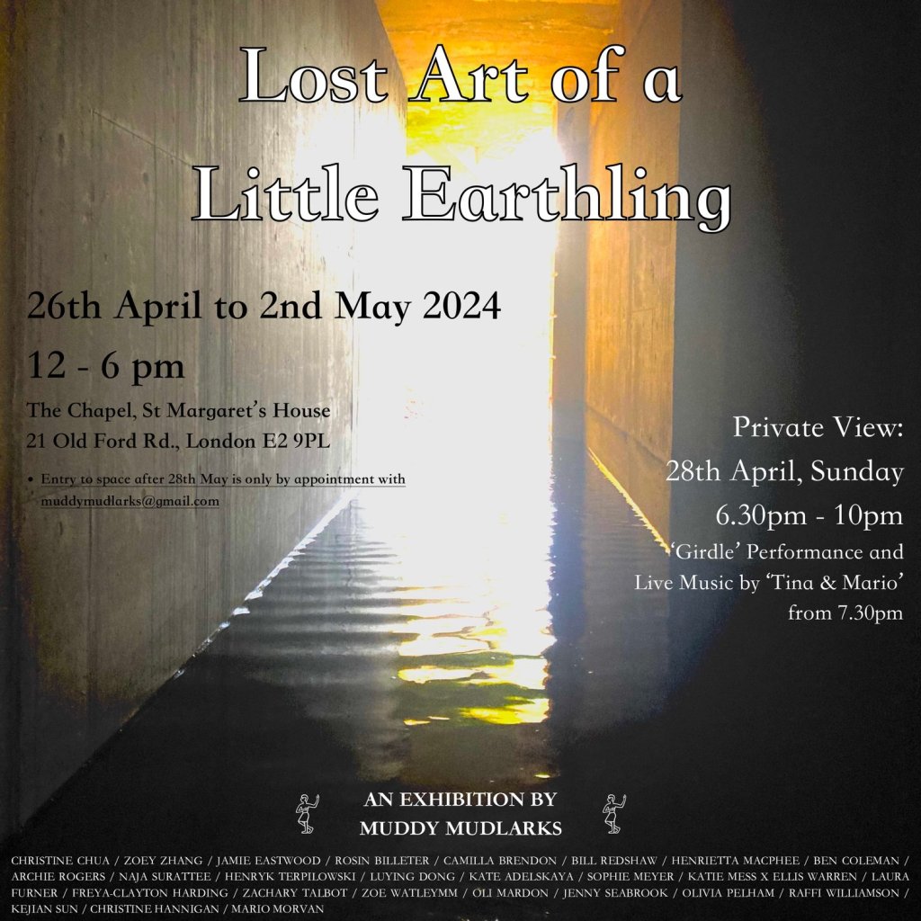 ‘Lost Art of a Little Earthling’ is “characterised by vague and unfamiliar terms: earthy, primordial, dark and strange. Through elaborate tales of woe and wonder, we return to a lost and primitive world, where clods of dirt and pebbles are treasured, and residual dreams of youth float to surface. Our artists sketch a passing shadow, before it bobs off, into the dying sun, over the momentary horizon because, after all, did it ever happen?” – Muddy Mudlarks