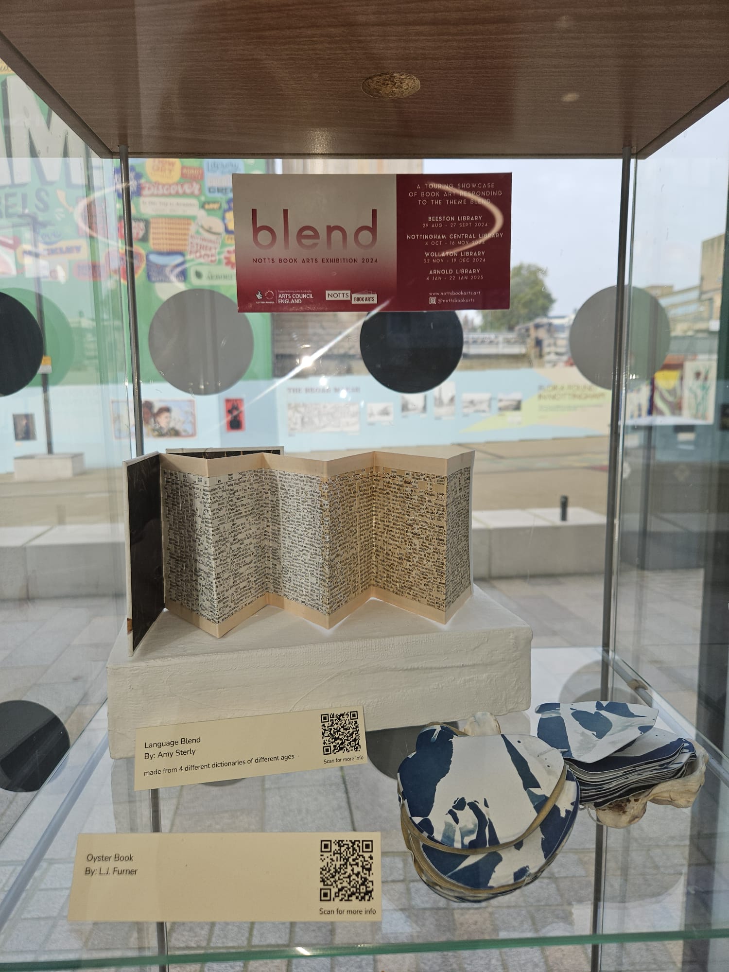 The Notts Book Arts’ BLEND exhibition is the first touring exhibition I have been a part of, and it has been wonderful to see the Oyster Book swimming along to libraries across Nottingham thanks to the careful handling and thoughtful curation of Jenny Stevenson and Hilke Kurzke.