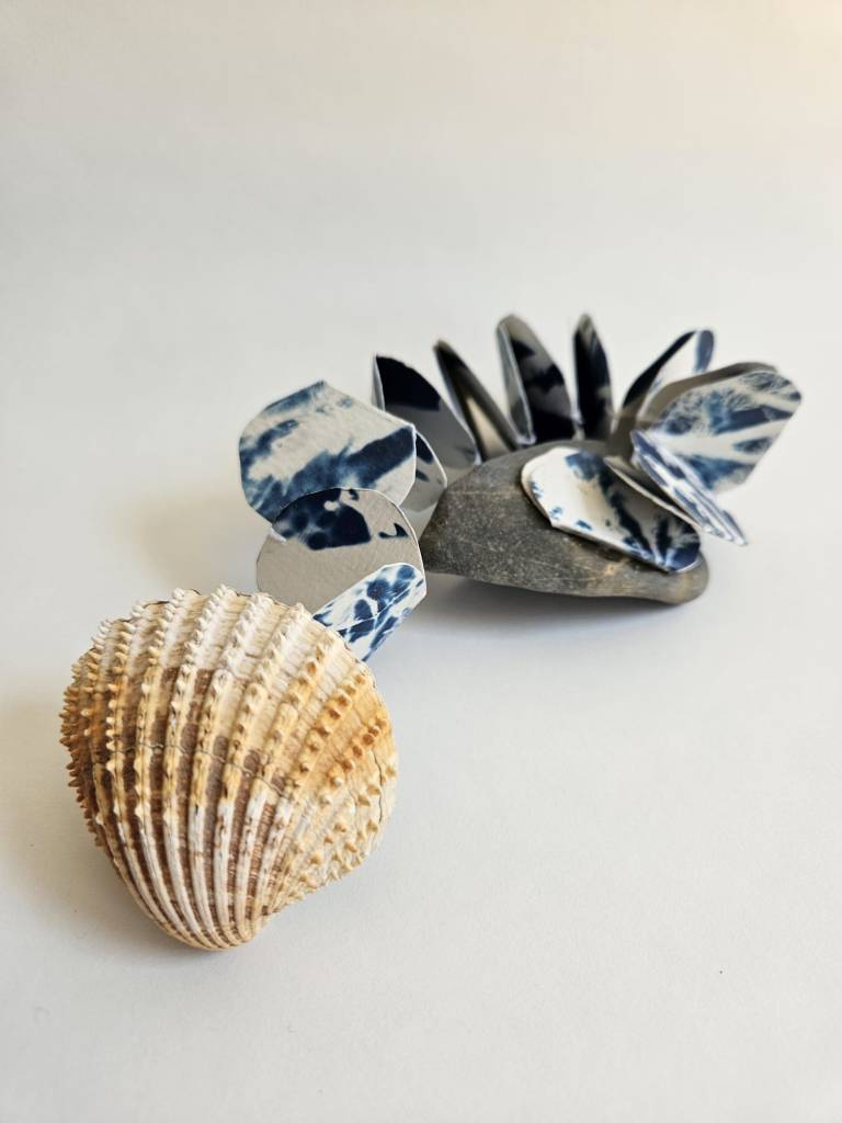 Cockle and Stone is an artist book exploring connectivity, space and play within tidal zones. A hand-stitched chain of seaweed cyanotypes connects a cockle shell with a small stone found on the foreshore in Kent, linking two found objects that did not necessarily originate but ultimately ended up in the same tidal space. The linking ‘chain’ of cyanotypes is hidden in the space between the rounded shell and the flat surface of the stone, and is revealed through interaction with the piece, exploring how human interaction in nature can be a playful and connective influence.