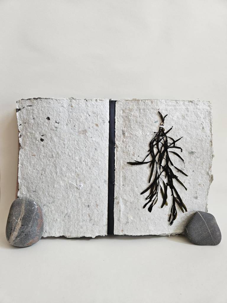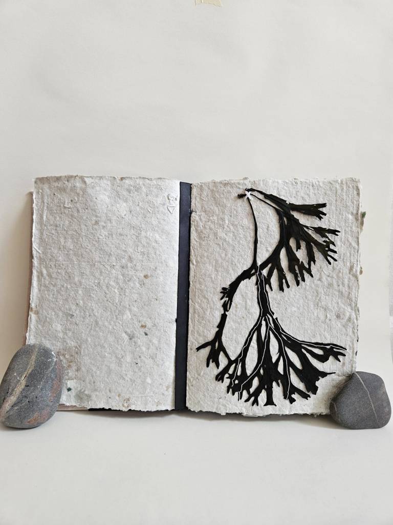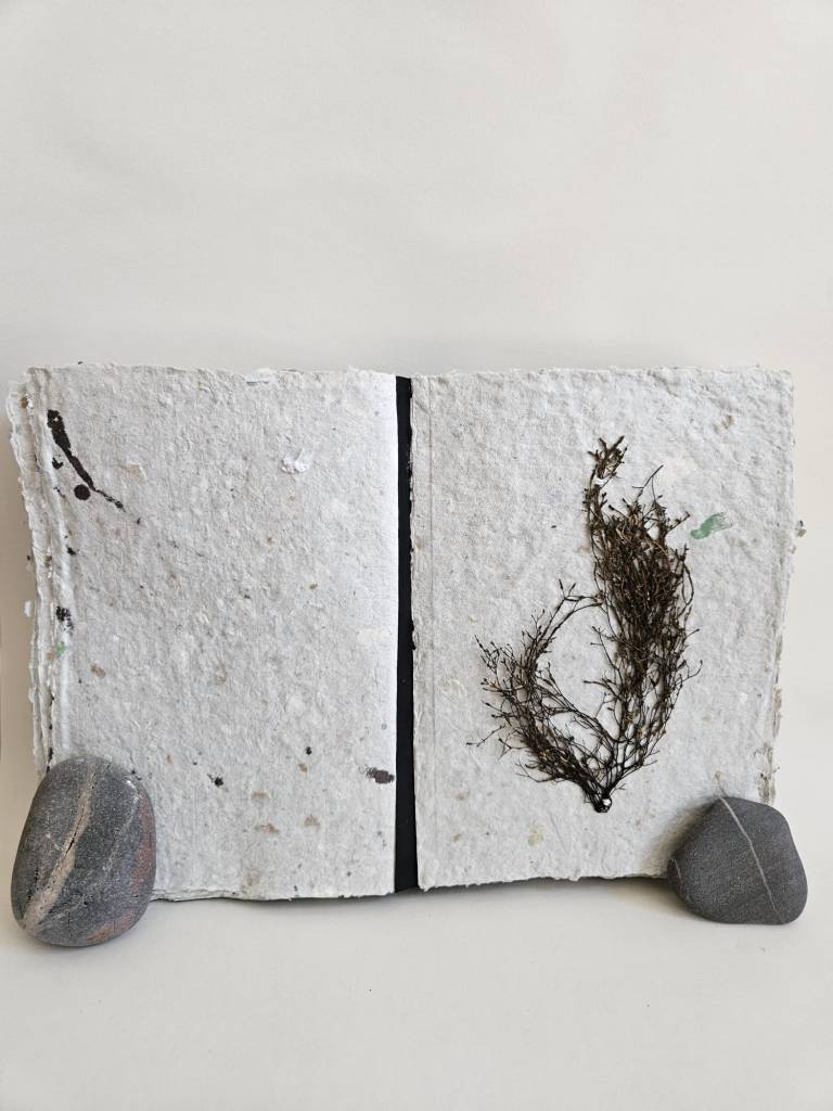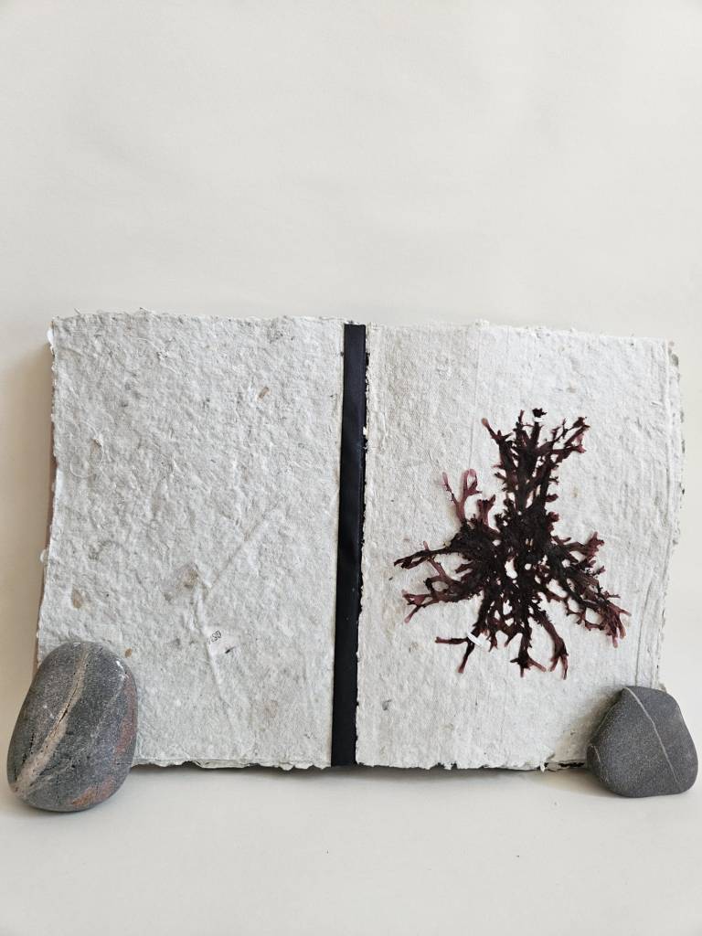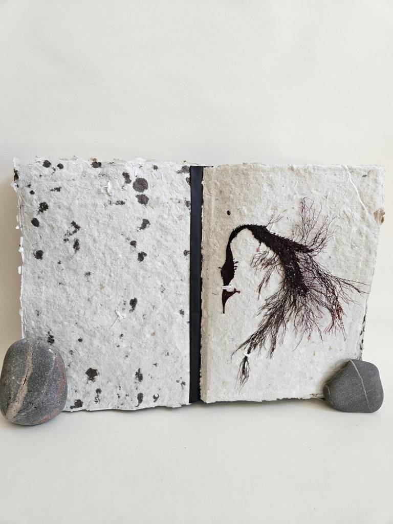 Rockpooling is an artist book documenting seaweed found adrift in tidal pools, having broken off from the holdfast and become interlopers in a liminal tidal zone. Each piece of seaweed is pressed and stitched into a book which viewers are invited to touch and explore, ‘reading’ each page like the surface of a rockpool, tracing the edges of a tiny world. Intuitive marks made with oak gall ink and applied with driftwood and seabird feathers accompany some of the pages, reflecting ripples on the water, memories of long ago tides.
