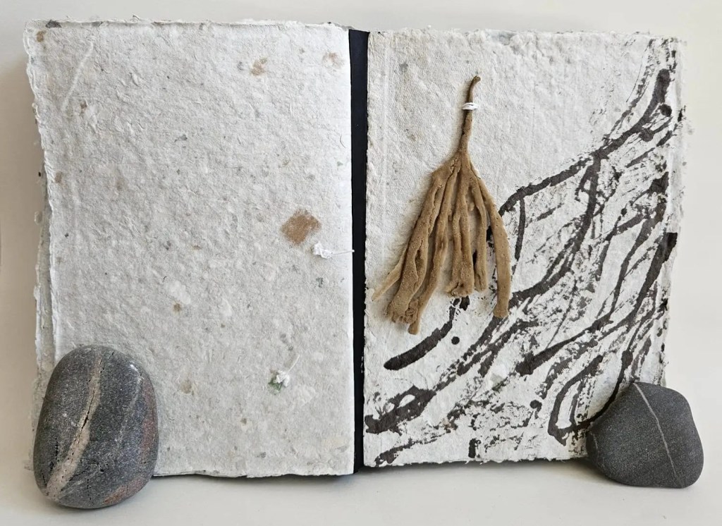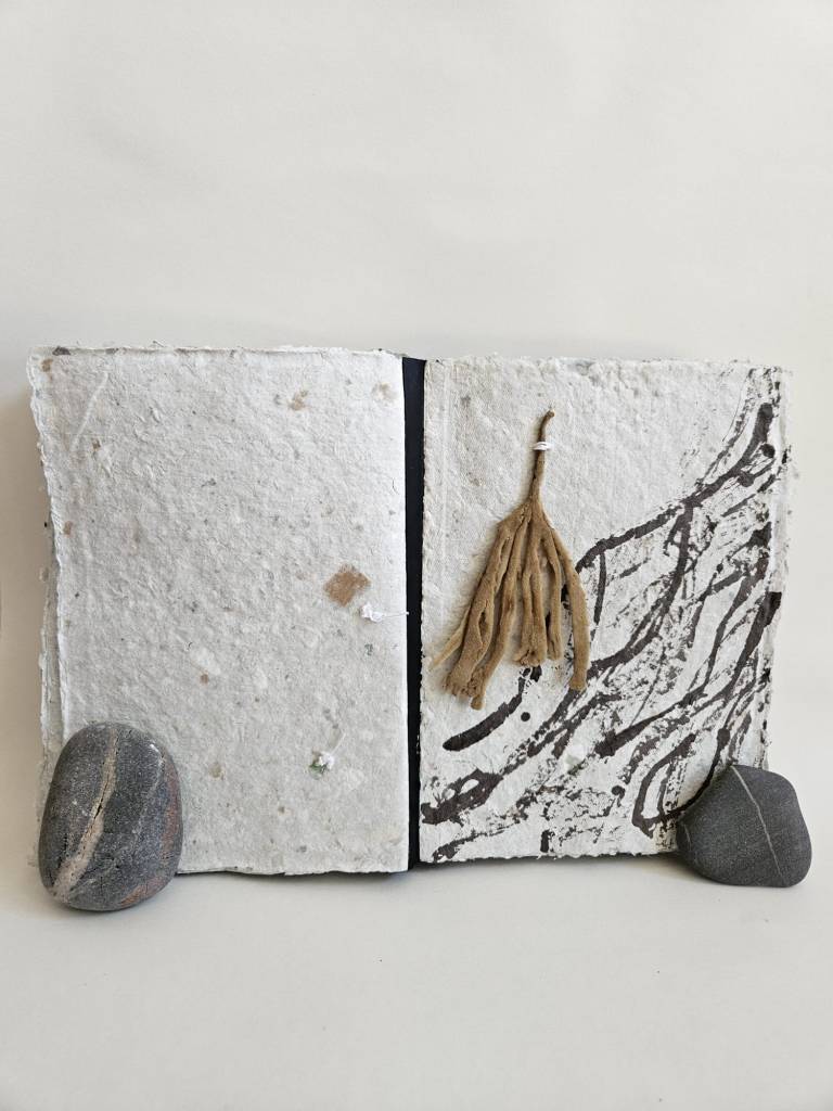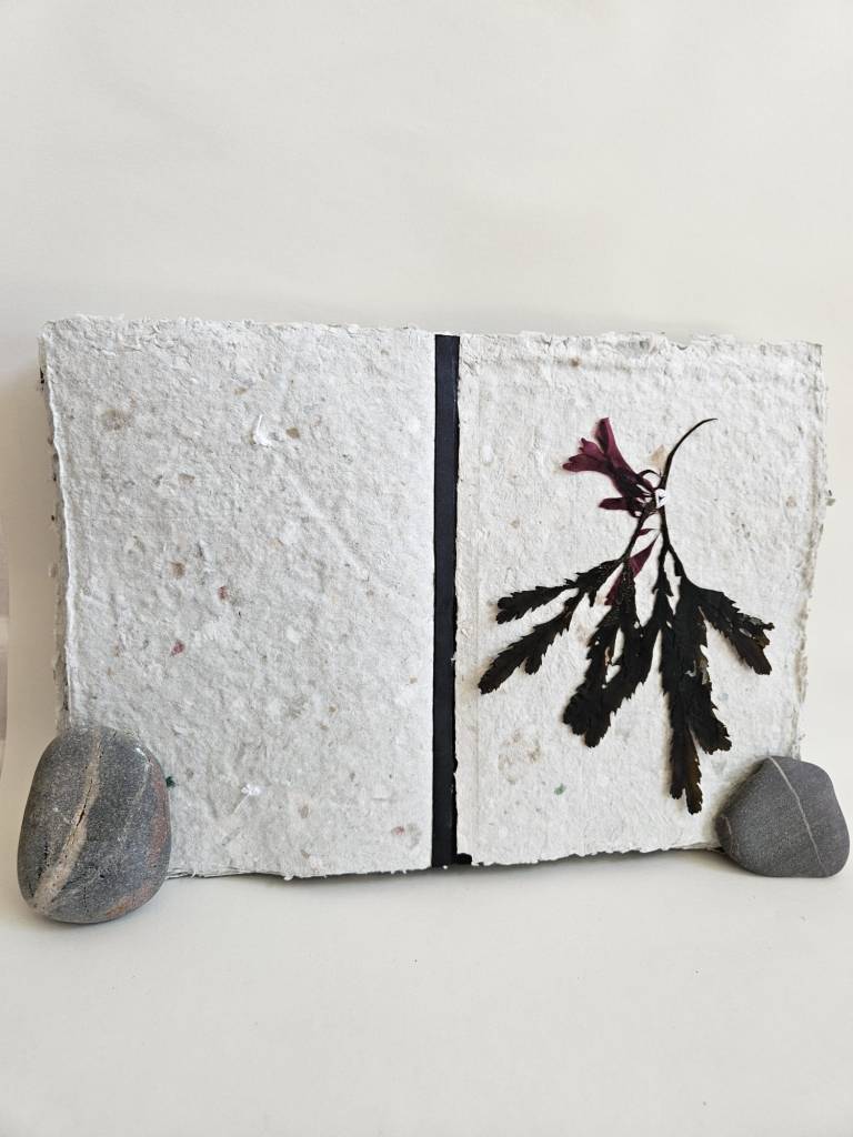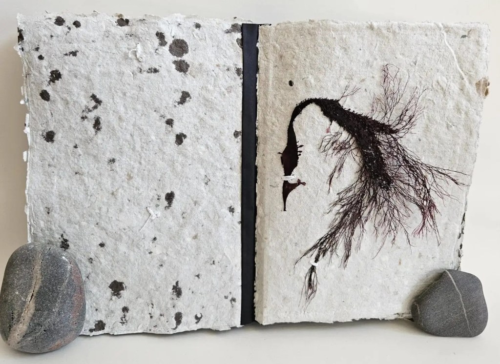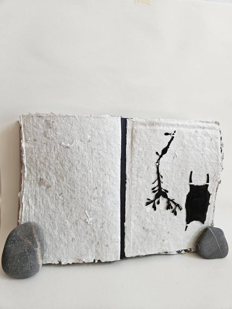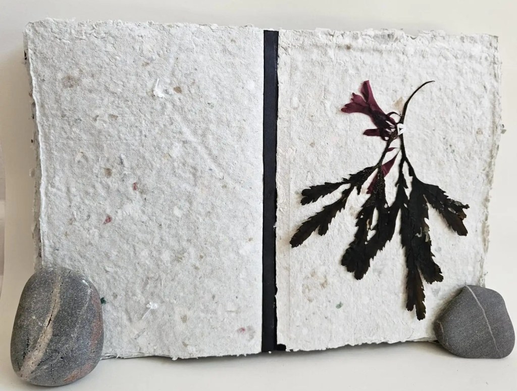 Rockpooling is an artist book documenting seaweed found adrift in tidal pools, having broken off from the holdfast and become interlopers in a liminal tidal zone. Each piece of seaweed is pressed and stitched into a book which viewers are invited to touch and explore, ‘reading’ each page like the surface of a rockpool, tracing the edges of a tiny world. Intuitive marks made with oak gall ink and applied with driftwood and seabird feathers accompany some of the pages, reflecting ripples on the water, memories of long ago tides.